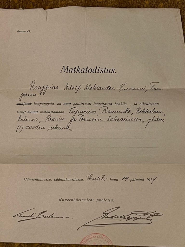 ..asiat olivat todellakin toisin. Oheisena Aatun hakema matkatodistus, jonka avulla hän saattoi käydä eri paikkakunnilla hoitamassa liikeasioita. Huomio kiinnittyy 1917 keväällä mainittuun kohtaan, jossa hänet on luokiteltu luotettavaksi henkilöksi, jonka takia hän saattoi matkustaa Tampereelta Viipuriin, Raumalle, Kokkolaan, Ouluun, Kemiin ja Tornioon liikeasioissa.